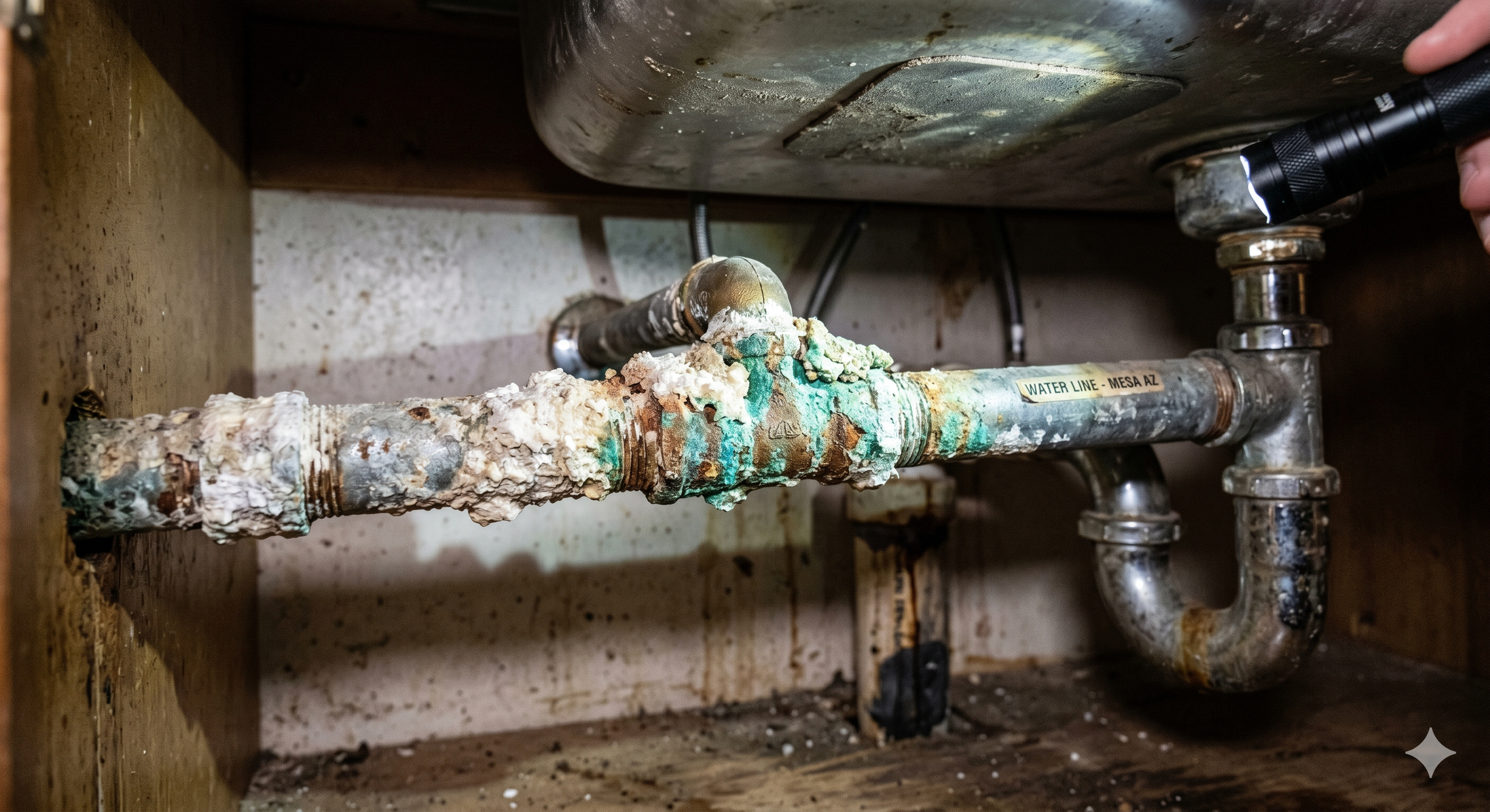 Mesa's water is hard, and older plumbing pays the price. We regularly find pinhole leaks in